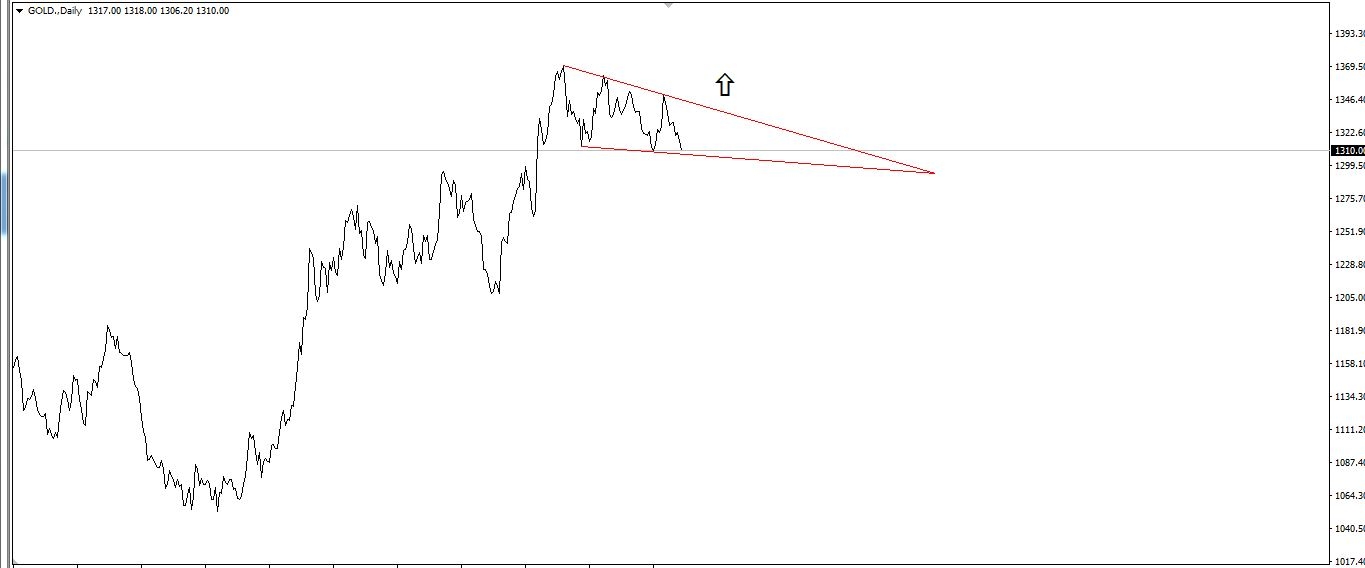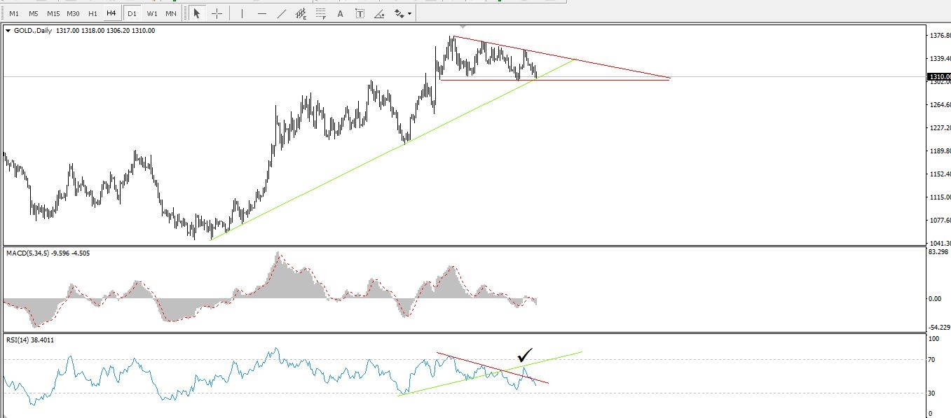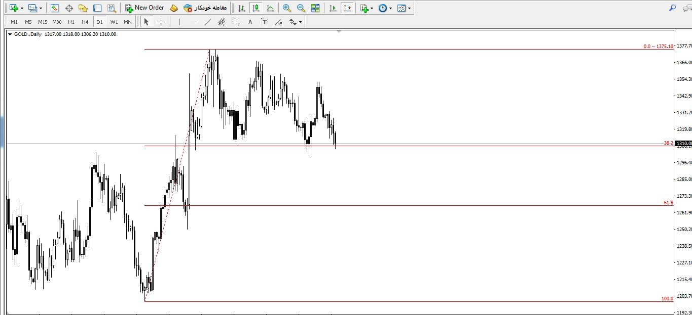 طلا در تایم روزانه با نگاه های مختلفی روبروست . برخورد با خط روند - احتمال تشکیل مثلث نزولی - احتمال تشکیل کنج پایین رونده ادامه دهنده  صعودی  - حر کت کردن خط سیگنال macd  همچنان درون میله های فروش - پول بک نکردن  ار اس ای روی خط روند نزولی شکسته شده ( قرمز ) و تعبیر پولبک روی خط روند صعودی شکسته شده ار اس ای ( سبز ) - نشانه های ادامه نزول بیشتر است - منتهی چون در روزهای ابتدایی هفته فاند موثر وجود ندارد . احتمال واکنش به خط روند و سطح حمایتی 1310 زیاد است . و شاید شاهد یک رشد موقتی کم حجم دیگر تا محدوده 1340  باشیم . نا گفته نماند که همین محدوده 1310 ، سطح 38.2 % نیز هست . و نبرد خرسها و گاوها به معنی واقعی در این محدوده روی داده است .