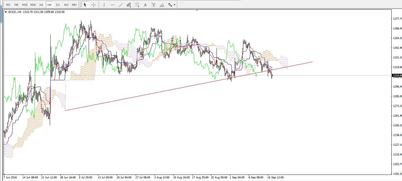 همانطور که پیشتر هم عرض شده - اونس طلا در تایم هفتگی با تغییر وضعیت تن کن سن روبروست .  و چون حالا حالا ها ( تا 10 هفته دیگه ) کیجن قصد بالا اومدن نداره ( مگر سقف 1375 شکسته شود) ، قاعدتا تن کن قیمت را برای کیجن می اورد :   . 1286   -   به هر حال نشانه ای از صعود در این تایم دیده نمیشود مگر مقاومت تاریخی 1310 که هم اکنون تبدیل به حمایت شده و خریداران به امید این حمایت در حال خرید هستند .